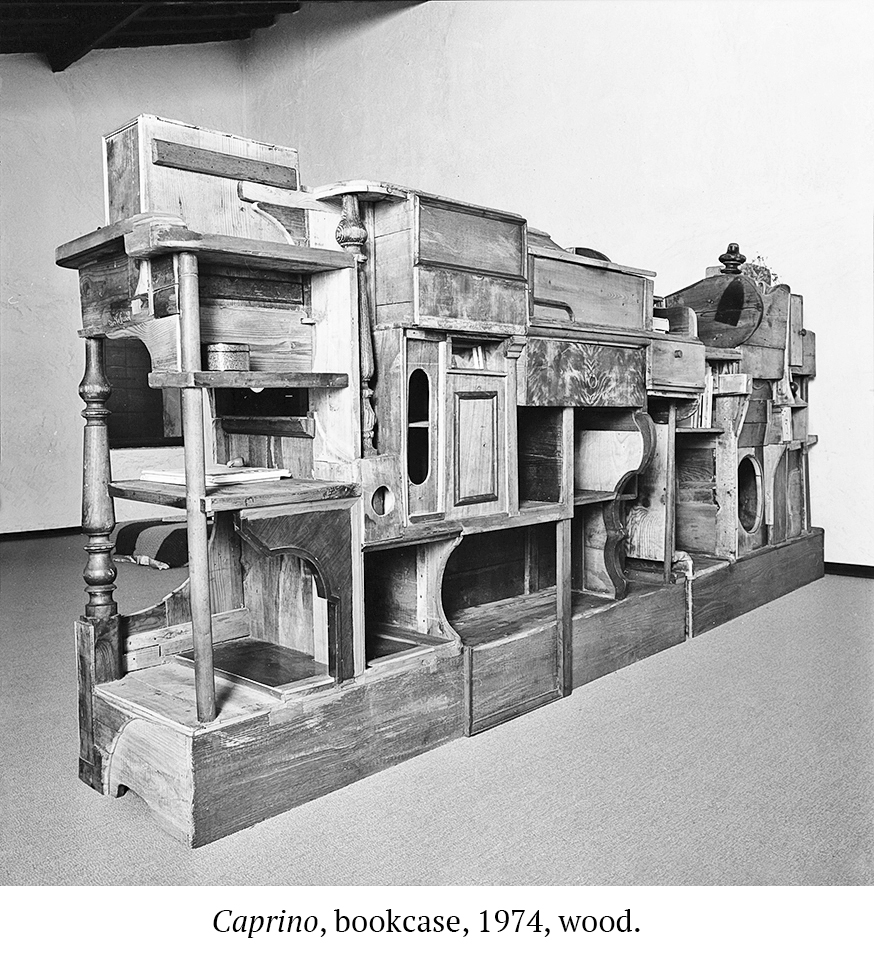 Lorsqu’il s’installe dans une maison ancienne de Vérone en 1971, Pucci de Rossi fait le tour des brocanteurs pour l’aménager. Mais, plutôt que de restaurer les meubles, Pucci va les démembrer et les reconstruire. “J’aurais pu changer par exemple le pied qui manquait, mais ce qui me plaisait c’était de récupérer un travail artisanal et de donner une deuxième vie à tous ces fragments. Tous les éléments que j’utilisais étaient déjà “usés”, je voulais donner à cet “usage” toute sa signification, et conserver à mes créations une fonction.” Sans le savoir, il posait là les bases de sa première démarche artistique, un travail sur la mémoire, mêlant formes et fonctions, art et mobilier. Exploitant les accidents des éléments juxtaposés, développant un galbe, améliorant une ligne, Pucci de Rossi magnifie le vernaculaire et donne naissance à un rêve de designer: la “sculpture à vivre”.